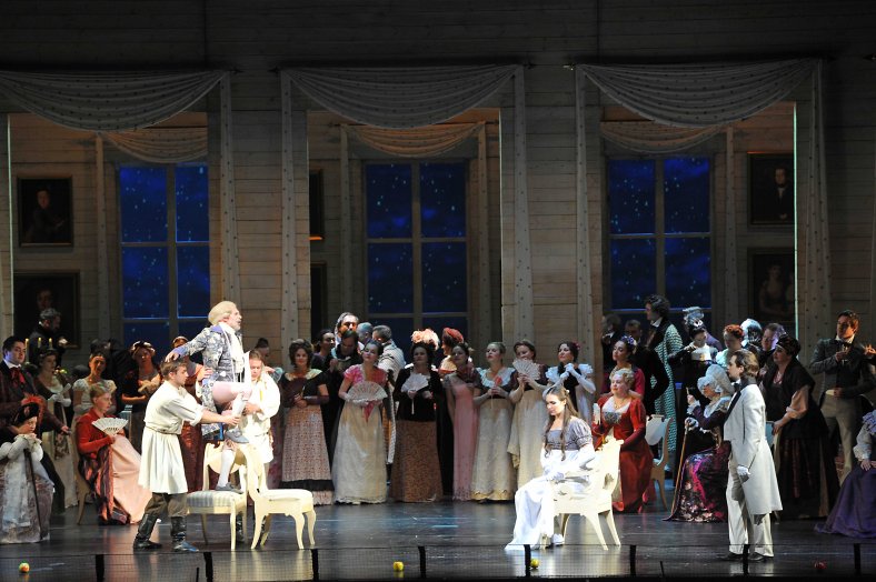 Come ogni anno, la stagione del Festspielhaus Baden-Baden si è conclusa con la tradizionale visita dei complessi del Teatro Mariinsky di St. Petersburg. Il rapporto tra le due istituzioni dura sin dalla fondazione del teatro, che fu inaugurato il 18 aprile 1998 proprio con un concerto della Mariinsky Orchestra diretto da Valery Gergiev. Il sessantaquattrenne maestro moscovita ha sempre mantenuto stretti legami con il Festspielhaus, nel cui comitato artistico occupa un posto sin dagli inizi dell’ attività, e nel corso degli anni ha presentato al pubblico di Baden-Baden alcune tra le migliori produzioni del Mariinsky, teatro che sotto la sua direzione ha raggiunto un posto di primissimo piano a livello mondiale. Quest’ anno, oltre ai soliti concerti sinfonici, Gergiev ha portato in Germania l’ allestimento di Eugen Onegin presentato per la prima volta a St. Petersburg nel 2014 e come di consueto affidato per la parte scenica ad Alexei Stepanjuk, regista pietroburghese che dal 1993 collabora col Mariinsky dove ha allestito, oltre a diversi titoli del repertorio internazionale, quasi tutte le grandi opere del teatro lirico russo. Come per la Pikovaja Dama vista qui nel 2015, lo stile della messinscena era un esempio tipico di quella contaminazione tra stile teatrale russo ed elementi occidentali che da sempre caratterizza molti spettacoli del teatro di Sankt Petersburg. Anche in questo caso si trattava di una bella regia, molto elegante e ammirevole per leggibilità, compostezza e bellezza classica delle immagini sceniche. Il dispositivo scenico ideato da Alexander Orlov consistente in un impianto fisso con pochi elementi essenziali a creare i vari ambienti, gli stupendi costumi creati da Irina Cherednikova, ammirevoli per buon gusto e ricchezza decorativa e le magnifiche luci di Alexander Sivaev contribuivano a formare uno spettacolo attraente e raffinato pur nella essenzialità della concezione, davvero efficace nel rendere tutte le sfumature drammatiche della vicenda, che da questa lettura scenica è uscita evidenziata al meglio sotto ogni punto di vista.