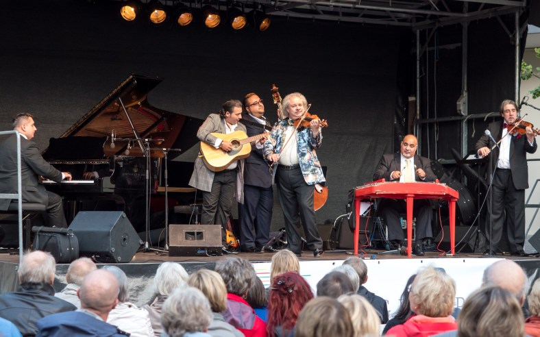 Il primo di questi appuntamenti si è tenuto nel cortile della sede della Klett Verlag, una ditta fondata nel 1897 che costituisce uno tra i principali gruppi editoriali di Stuttgart ed è specializzata nella produzione e stampa di testi scolastici e materiale didattico. Protagonista della serata era la band di Roby Lakatos, cinquantaduenne nato a Budapest da una famiglia di origini rom che da anni è considerato il simbolo vivente del violinismo tzigano. Ma Lakatos, che nel corso della sua carriera internazionale si è esibito insieme ai massimi musicisti classici e del jazz, è un artista che nelle sue serate mescola la cosiddetta musica classica con la magia della vitalità ungaro-zigana, riflette la profonda tradizione radicata nel patrimonio culturale del popolo zigano, e offre nuovi e rivitalizzanti piaceri all’ascoltatore e all’appassionato. Non si tratta solamente di un virtuoso tecnicamente agguerritissimo, ma di un musicista raro che può suonare musica classica, jazz, e naturalmente la musica popolare ungherese con grande energia e maestria e che con il suo violino ridefinisce ogni genere. Il concerto alla Klett Verlag, nel quale il violinista magiaro ha offerto due ore delle sue splendide improvvisazioni in cui si mescolavano elementi del prpertorio classico con spunti jazzistici e con la magia della vitalità ungaro-zigana, offriva tutta una serie di nuovi e rivitalizzanti piaceri al pubblico, che si è divertito molto e ha tributato un vero e proprio trionfo agli artisti della band.