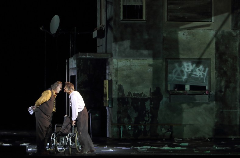 Facendo un bilancio d’ insieme, una direzione di qualità molto elevata e un cast che, nonostante i limiti individuali di alcuni elementi, funzionava abbastanza bene nel suo complesso anche per la prestazione lodevole di tutto il gruppo dei maestri, sono più che sufficienti ad assegnare un voto alto alla parte musicale. Purtroppo, come troppo spesso accade in Germania, la messinscena ha rischiato di rovinare la festa. La produzione di David Bösch è piaciuta pochissimo alla stampa tedesca, sulla quale dopo la prima di due anni fa sono apparse critiche severe e spesso anche di tono apertamente sarcastico. In questo senso, per chi ha qualche conoscenza della vita tedesca, erano divertentissimi il titolo Schwiegersöhne für Böhmermann (allusione al cabarettista politico Jan Böhmermann, conduttore del programma satirico Neo Magazine Royale su ZDF) della recensione di Manuel Brug su Die Welt e Deutschland sucht den Supersänger (riferimento al popolarissimo talent show Deutschland Sucht Die Superstar di RTL) dell’ articolo pubblicato sul Bayerische Staatzeitung. In effetti, quando sugli ultimi splendenti accordi di do maggiore che concludevano il Preludio magnificamente diretto da Petrenko, il sipario si alzava mostrandoci una scena simile a una borgata romana degli anni Cinquanta, di quelle che si vedono nel cinema neorealista italiano, oppure a un quartiere di Kabul negli anni dopo l’ invasione sovietica, la sensazione di disorientamento era abbastanza forte. A parte questo, rimane da chiarire quale contributo porti alla scoperta di nuovi aspetti dell’ opera un’ ambientazione tra il sottoproletariato urbano, con un Sachs che al posto della bottega gestisce un furgoncino da ambulante, un David che si muove con un ciclomotore e un Walther in giubbotto di pelle e jeans stile Marlon Brando in The Wild One, che si porta sempre dietro una custodia di chitarra come fa` Linus con la sua coperta. Anche l’ idea di trasformare la gara di canto in una sorta di reality show secondo me era abbastanza banale. Anche perché la recitazione di insieme, in diverse scene, era impostata come quella di decine di altre messinscene tradizionali dei Meistersinger, con una Eva che bamboleggia nella scena con Sachs che la tratta in maniera paternamente affettuosa, la solita Magdalene materna e molto pratica nel gestire la sua relazione con David e tutta una serie di bozzettismi visti e stravisti. Una regia il cui difetto principale, a tirare le somme, mi è parso quello di essere complessivamente irrisolta. Non si capiva, o almeno non l’ ho capito io, in quale direzione lo spettacolo volesse andare e quale fosse la scelta di lettura del regista di fronte alle concezioni esposte da Wagner in quest’ opera, che riguardano principalmente il ruolo dell’ arte nella società e la sua vicenda personale di artista alle prese con le convenzioni e i limiti alla libertà creativa impostigli dalle regole codificate tramite la tradizione. Ad ogni modo, di vere e proprie mostruosità da Regietheater spinto non se ne vedevano e quindi i pregi della parte musicale ripagavano ampiamente la mia soddisfazione personale. Il pubblico di München, che alle recite wagneriane arriva sempre numerosissimo, ha applaudito lungamente tutti i protagonisti riservando i consensi più calorosi a Kirill Petrenko, cosa su cui sono pienamente d’ accordo, e a Wolfgang Koch, cosa su cui io non sono d’ accordo per nulla.