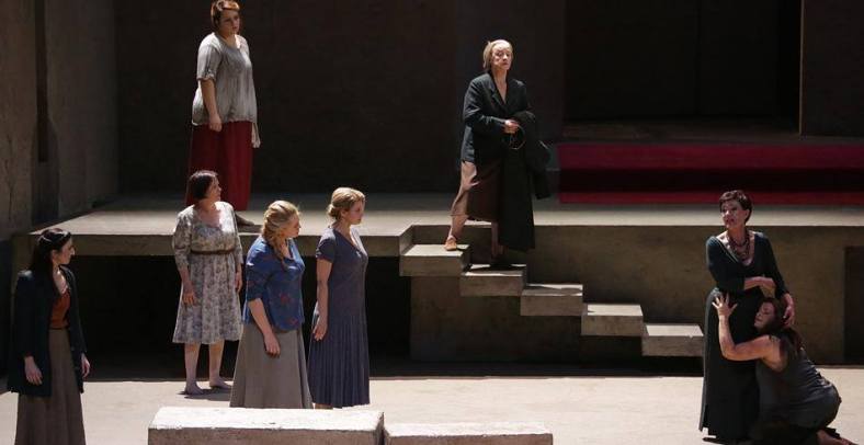 Il cast vocale merita un discorso a parte: parliamo di voci, soprattutto nel caso delle tre protagoniste, davvero molto piccole e facilmente coperte dall’ orchestra, comunque tenuta a un volume non debordante, e udibili solo quando la regia posizionava i loro movimenti al proscenio. In un altro teatro, avendo a disposizione delle cantanti di questo genere, si sarebbe optato per mettere in scena magari una Arabella, senza nulla togliere alle difficoltà del titolo, o un’ opera meno sfibrante per voci che non possiedono l’ acciaio richiesto e che avrebbe permesso loro di brillare con maggior costrutto. Ammiro molto il soprano Ricarda Merbeth, la cui voce luminosa e la sensibilità schietta vengono esaltata da ruoli lirici o spinti in molte occasioni, frequentando Wagner, Strauss, Berg, Beethoven con spesso buoni e ottimi risultati; ma la sua è e rimane una voce molto più adatta a Chrysothemis che ad Elektra, di cui queste recite rappresentano il debutto, e non perché in passato voci come la sua non abbiano affrontato un tale colosso (Annie Krull, prima interprete, ma anche Christel Goltz, Hildegard Behrens , Eva Johansson, la stessa Evelyn Herlitzius grandissima interprete delle recite del ’14), ma tutte padroneggiavano naturalmente l’ accento giusto, possedevano la scansione drammatica e la robustezza tecnica per affrontarlo. La signora Merbeth, altrove splendida Chrysothemis, semplicemente è una Elektra più infantile e dispettosa che tragica, più monotona che preoccupata di far affiorare le ragioni della sua tormentata psiche, troppo affaticata e preoccupata a centellinare i suoi massacranti interventi per preoccuparsi di creare un personaggio che vada oltre alla fanciulla ribelle. Fatica che la costringe a bere per ben tre volte dalla fonte posta a destra della scena! E se i centri ed i gravi vengono indeboliti da una scrittura che la sovrasta, almeno il registro acuto è udibile e solo nella scena dell’ agnizione del fratello e nel finale, ovvero il primo un momento più disteso e lirico ed il secondo sollecita il registro acuto, la voce può finalmente apparire più libera, ma senza coinvolgere emotivamente l’ascoltatore. Per fortuna viene graziata con i tre tagli tradizionali. Almeno la Merbeth avrebbe dato lustro alla produzione se fosse stata scritturata non per la protagonista, ma per sua sorella, in questo caso interpretata, purtroppo, da Regine Hangler. Gravemente insufficiente la performance di questo soprano dalla voce troppo chiara, linfatica e priva sia di colori timbrici che delle necessarie sfumature del fraseggio, e nonostante gli sforzi profusi anche piuttosto sgradevole nell’ intonazione incerta, oltre che scialba e insignificante come interprete. Anche nel suo caso si può parlare di errore di casting, a parere mio.