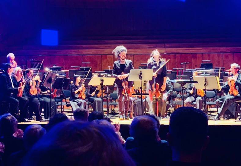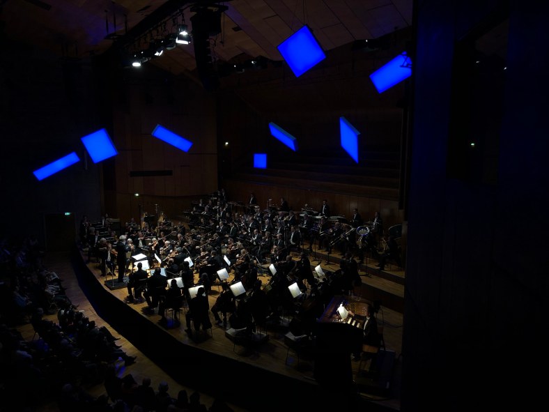 Dan Ettinger prosegue i concerti della sua quarta stagione da Chefdirigent degli Stuttgarter Philharmoniker, che nelle serate sotto la sua guida fanno sempre registrare una notevole partecipazione di pubblico. Per il concerto dedicato a musiche di Bach, Vivaldi e Gustav Holst, con la partecipazione dei violinisti Nemanja Radulović e Tijana Milošević, la Liederhalle era esaurita in ogni ordine di posti, con diverse persone che cercavano di procurarsi un biglietto prima dell’ inizio. La serata era la seconda del ciclo Sextett, quest’ anno intitolato Blau perché gli appuntamenti di questa serie si tengono con la scena illuminata da un’ installazione di luci blu realizzata da Nikolaus Koliusis, sessantacinquenne artista visuale nato a Salzburg e residente a Stuttgart che nel suo lavoro si occupa principalmente degli effetti visivi come mezzo centrale della percezione spaziale e dei loro risultati sulla relazione dello spettatore con lo spazio fisico o architettonico. I materiali trasparenti e riflessivi spesso usati nel suo lavoro contribuiscono a generare processi riflessivi di percezione tramite i quali lo spettatore è portato a riflettere sulla sua identità e quindi sulla sua relazione con il mondo circostante. L’ esempio pratico si può vedere in questa foto ripresa durante il concerto.