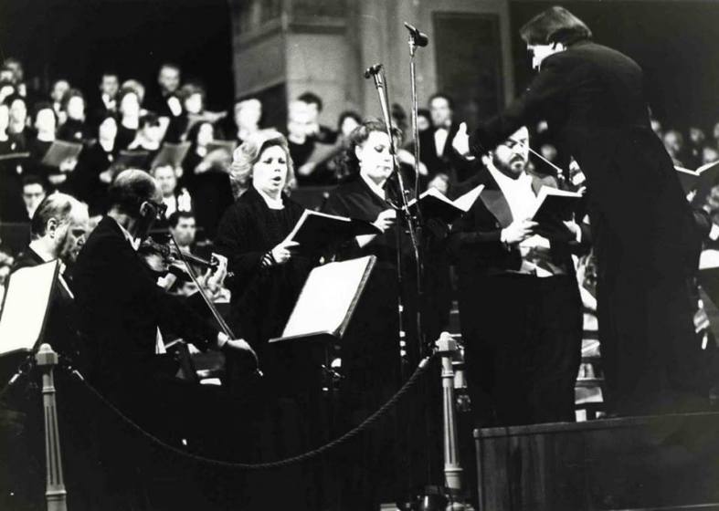 Come terza testimonianza ho scelto la Messa di Requiem di Verdi, una partitura che Abbado diresse quasi ogni anno nel suo periodo di lavoro alla Scala e in moltissime altre occasioni. Nel mese di aprile del 1980 io ebbi il privilegio di assistere a una sua straordinaria esecuzione del capolavoro verdiano nel Duomo di Parma, con i complessi della Scala e, come solisti, Mirella Freni, Elena Obratzsova, Luciano Pavarotti e Ruggero Raimondi.  Ecco una foto di quella serata assolutamente indimenticabile.