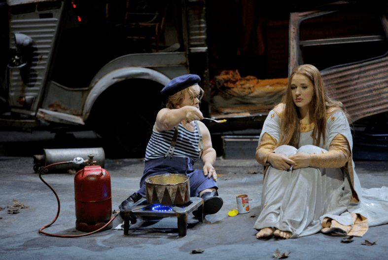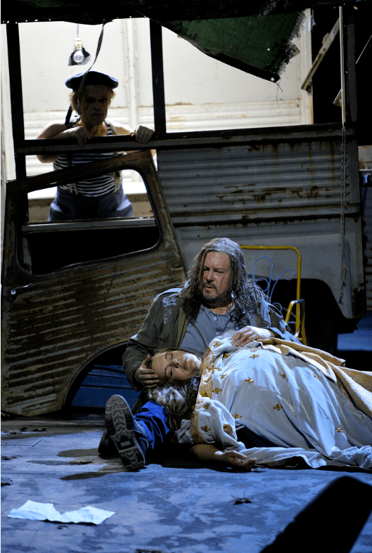 A beneficio degli ignari, voglio qui descrivere sommariamente quanto si vede nella messinscena di Kratzer. Durante l’ Ouverture, un filmato ci fa vedere un vecchio furgoncino Citroen, sul quale viaggiano quattro artisti underground: un clown (Tannhäuser), una drag queen di colore (Le Gateau Chocolat), un ragazzo fisicamente deforme (Manni Laudenbach) vestito esattamente come il personaggio di Oskar Matzerath nel celebre romanzo Die Blechtrommel di Gunter Grass e una ragazza (Venus) in top scollato e pantaloni neri a paillettes. I quattro personaggi si dedicano ai flash-mobs e durante una delle loro scorribande uccidono un poliziotto investendolo col furgone. Anche a causa di questo fatto increscioso Tannhäuser, che si intuisce essere stato un artista di rango, passato alle esibizioni da strada per anticonformismo e voglia di nuove esperienze, è stufo di questa vita e decide di rientrare nel suo mondo. Lanciatosi dal furgone in corsa, si trova vicino al Festspielhaus dove stanno arrivando gli spettatori e il personale di scena; tra questi ultimi, riconosce i suoi ex compagni d’ arte che lo invitano a ritornare con loro.