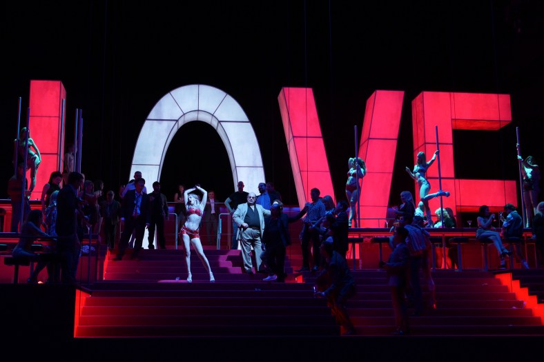 La nuova produzione della Manon Lescaut in scena in questi giorni all’ Oper Frankfurt è divenuta l’ argomento del giorno nel mondo musicale qui in Germania. Il successo clamoroso della prima, recensita da pressoché tutti i colleghi della stampa tedesca, mi ha spinto a fare una visita nel teatro della città assiana (un bell’ edificio moderno costruito ai primi degli anni Sessanta, con una sala comoda e acusticamente molto buona situata dietro un foyer chiuso al primo piano da una parete a vetri che costituisce la facciata) soprattutto per ascoltare dal vivo Asmik Grigorian, trentottenne cantante lituana di origini armene che, dopo i trionfi al Salzburger Festspiele come Salome nella messinscena di Romeo Castellucci e alla Scala come Marietta in Die Tote Stadt di Korngold, è stata da poco nominata Sängerin des Jahres dalla rivista tedesca Opernwelt, quasi all’ unanimità. La Grigorian, che è figlia di due artisti illustri come il defunto tenore Gegam Grigorian e il soprano Irena Milkevičiūtė, è una fra le cantanti più celebrate del momento e io, dopo aver visto il video della sua Salome salisburghese, che ho trovato magnifica, e aver letto decine di recensioni assolutamente entusiastiche, ero decisamente curioso di vederla in questa produzione il cui risultato è stato davvero grandioso, addirittura al di là di quanto avevo ricavato dalla lettura delle critiche. Quella a cui ho assistito è stata una meravigliosa serata di teatro musicale per merito soprattutto della cantante lituana e del regista Álex Ollè, che già avevo apprezzato nel bell’ allestimento del Mefistofele da lui messo in scena la scorsa estate alla Staatsoper Stuttgart. Il cinquantanovenne regista catalano, uno dei sei fondatori e direttori artistici del celebre collettivo teatrale La Fura dels Baus, racconta la storia trasformando Manon, come mostrato in un video proiettato all’ apertura di sipario, in una ragazza dell’ Est emigrata illegalmente nell’ Europa occidentale al seguito di un fratello privo di scrupoli che vorrebbe sfruttarla per arricchirsi. Dopo essere sfuggita alle attenzioni di un vecchio e ricco pervertito dandosi alla fuga con Des Grieux che si è innamorato di lei a prima vista, la ragazza nel secondo atto reincontra il suo innamorato in un sordido locale di lapdance dove è stata rinchiusa dal vecchio, cerca di darsi alla fuga col suo amante appena ritrovato dopo aver svuotato la cassa del locale ma viene arrestata dai poliziotti chiamati dal ricco libertino e rinchiusa in un centro di detenzione per clandestini in attesa di essere espulsa, con Des Grieux che la ritrova e ottiene di partire insieme a lei. Le scene di Alfons Flores sono costituite da pochi elementi essenziali tra cui spicca un enorme scritta formata dalle lettere della parola LOVE, che fanno da sfondo a tutta la vicenda e nell’ ultimo atto divengono il solo elemento scenico della straziante tragedia finale.