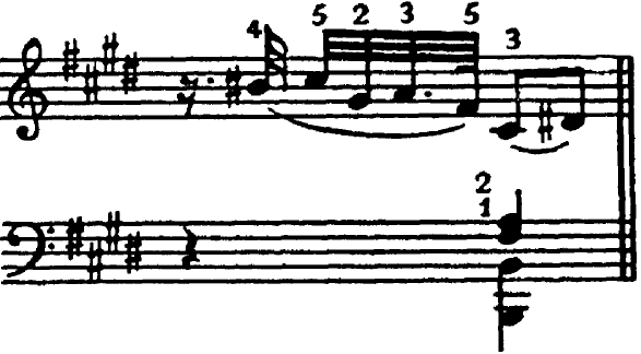 The Sonata No. 1, in F minor, has been called the little Appassionata’, and we might call this one the ‘ littleWaldstein’. Its character is one of artistic virtuosity and brilliance. Opinions differ, however, about the way itshould be performed. No doubt it displays the young Beethoven’s delight in his own unusual pianistic skill but it would be wrong to exaggerate the tempi and regard virtuosity as the sole end of the work. After all, the music is the body and the technique merely the clothing. The thematic material of the first movement Allegrocon brio comes from a Piano Quartet in C major which Beethoven wrote when he was fifteen. The movement really contains five ideas of which the third and fourthmay be considered as forming the second subject. The third begins in G minor and the fourth is in G major, the obligatory dominant. The fingering of the opening thirds is: