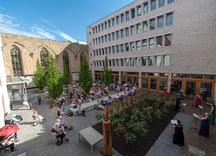 Di grande raffinatezza è apparsa anche l’ esecuzione dei brani tratti dalle due raccolte Lieder im Freien zu singen per coro misto a cappella op. 59 e op. 78 di Mendelssohn. Nel piccolo cortile dell’ Hospitalhof in cui il coro era posizionato dietro alle aiuole delle rose con un effetto visivo di grande bellezza, la freschezza melodica di questi brani in cui il compositore di Leipzig mescola sapientemente lo stile dei canti popolari con soluzioni di scrittura estremamente raffinate, come accade ad esempio nel celebre “Abschied vom Walde” op. 59 N°3 in cui la struttura strofica del testo di Joseph von Eichendorff è trattata con una serie di delicatissime sottigliezze strutturali, si univa alla suggestione evocata dal luogo per un risultato complessivo musicalmente davvero affascinante. Si tratta di brani che tutti i sodalizi corali tedeschi hanno nel loro repertorio e quindi amatissimi da un pubblico che li conosce quasi come una lingua materna. Il successo non manca mai quando vengono eseguiti in concerto e anche in questa occasione il pubblico è stato conquistato dall’ effetto complessivo scaturito dalla combinazione di musica e ambiente. Davvero una bella ripartenza, questa serata di livello assai raffinato che la Bachakademie Stuttgart ha presentato per poter riprendere contatto con il suo pubblico in attesa della prossima stagione, che dovrebbe avere inizio regolare nel prossimo mese di ottobre con i due cicli di Akademiekonzerte a Stuttgart e a Ludwigsburg già presentati alla stampa e al pubblico nelle scorse settimane.