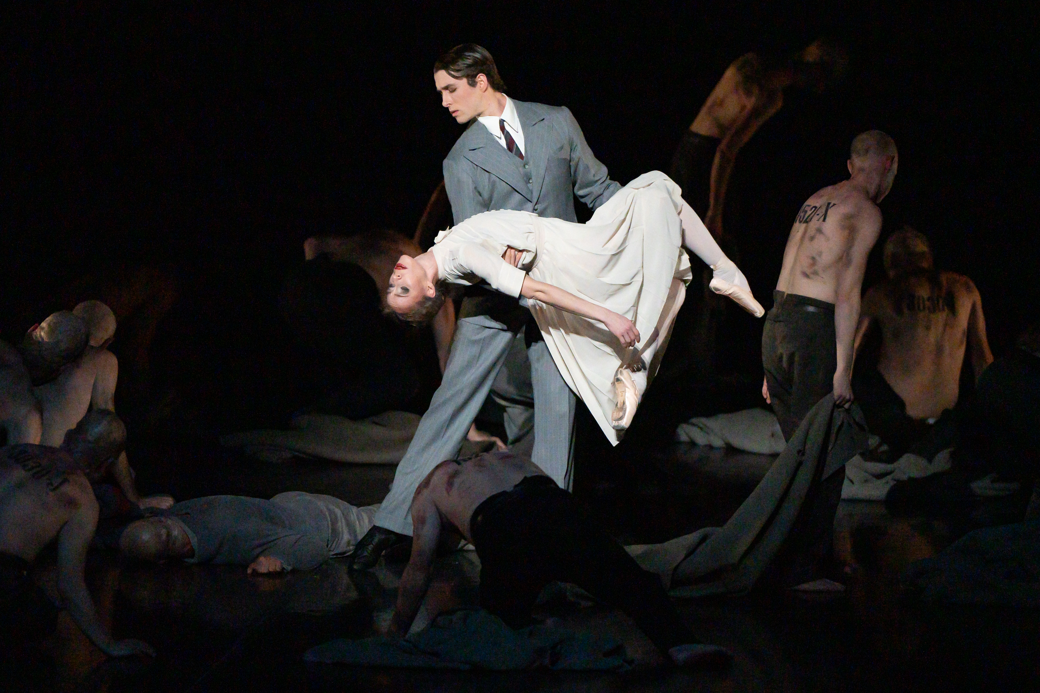 Con una splendida invenzione, Cranko aggiunge ai danzatori un gruppo di comparse vestite con abiti simili a sacchi, che lasciano cadere nel momento culminante della musica di Mahler, sul famoso accordo di dodici suoni che rappresenta il vertice di questo crescendo dissonante di disperazione, sotto la luce accecante dei riflettori, con i numeri impressi sul retro che diventano visibili. Ma alla fine, sulle note luminose delle battute conclusive la speranza prevale mentre la coppia cammina lentamente insieme verso un quadrato di luce che si apre sul retropalco. Potente, espressivo e carico di tensione, Spuren costituisce l’ estrema testimonianza di uno tra i più grandi coreografi di tutta la storia della danza. Nella recita a cui ho assistito, le tre figure principali erano impersonate da Anna Osadcenko, Satchel Tanner e Jason Reilly, straordinariamente minaccioso e inquietante nel realizzare l’ incubo del passato che perseguita la donna. Un grande contributo alla qualità di questa magnifica serata veniva anche dal mezzosoprano Claudia Hucke, dal tenore Mihail Culpajevs e dal baritono Michael Wilmering che hanno cantato le parti vocali, oltre che dalla splendida prova della Staatsorchester Stuttgart diretta da Mikhail Agrest. Successo entusiastico per una serata che suscitava emozioni profonde, di quelle che poi ti fanno riflettere a lungo. Vale sempre la pena di andare a vedere una recita dello Stuttgarter Ballett!
