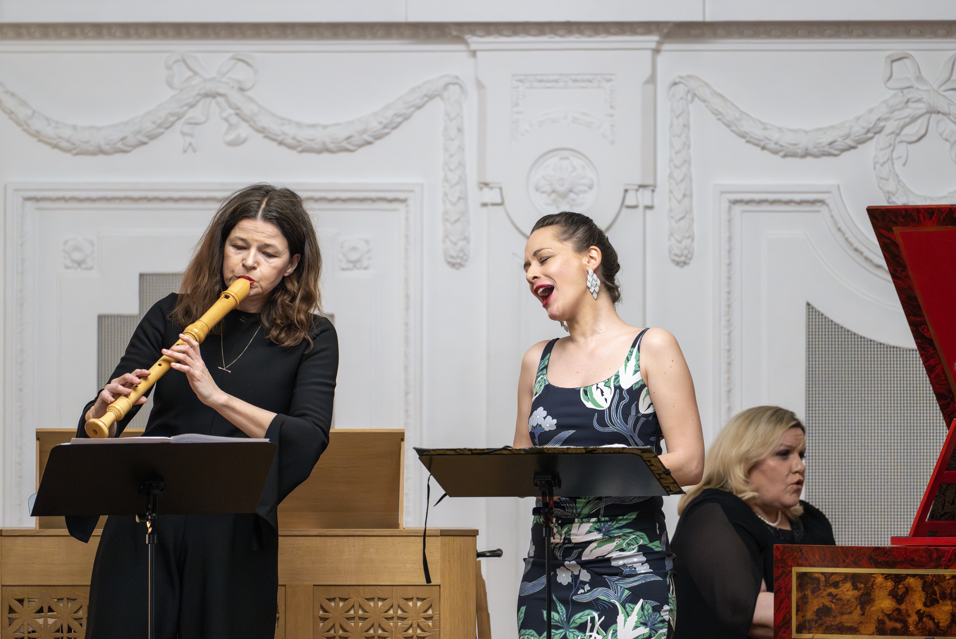 La parte musicale era affidata a Dorothee Oberlinger e agli strumentisti dell’ Ensemble 1700, complesso strumentale da lei fondato nel 2002. Conosco la Oberlinger da diversi anni, anche per la sua assidua collaborazione con i miei carissimi amici del gruppo trevigiano I Sonatori de la Gioiosa Marca, e quando si esibisce da queste parti non manco mai di andarla ad ascoltare. La cinquantacinquenne flautista tedesca non è solo un autentico prodigio di perfezione tecnica e stilistica, qualità che ne fanno la migliore virtuosa del suo strumento dai tempi del grande Frans Brüggen, ma le caratteristiche del suo modo di far musica sono di altissimo livello non solo per l’ eleganza del fraseggio, la scrupolosa attenzione nell’ ascoltarsi reciprocamente con i musicisti che suonano insieme a lei e nel calibrare gli accenti, i tempi e i colori in sintonia con il complesso strumentale, ma soprattutto per una concezione della musica intesa non come semplice esibizione virtuosistica ma come autentico piacere nel suonare insieme. Tutto questo porta Dorothee Oberlinger a ottenere risultati interpretativi davvero di altissimo livello, come in poche altre occasioni è possibile ascoltare in questo repertorio. Anche in questa serata la sua perfetta intesa interpretativa con gli altri musicisti, unita alla logica creativa di un programma impaginato in maniera intelligente e originale oltre che splendidamente eseguito per la bravura assoluta di tutti i partecipanti, è stata premiata da un grande successo di pubblico.