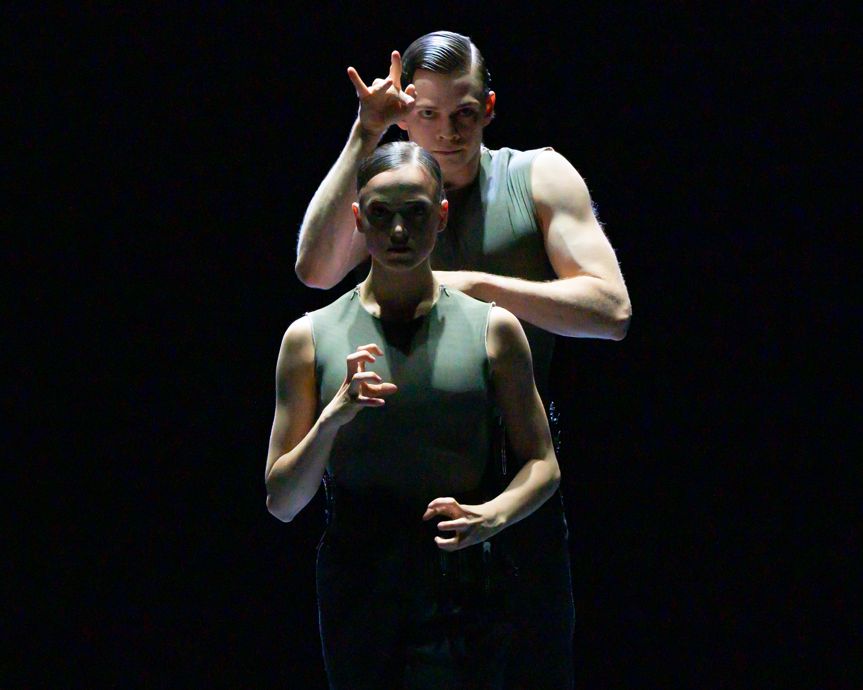 Il terzo brano della serata, Nachtmerrie, che in olandese significa incubo, è un lavoro di Marco Goecke, per diversi anni Hauscoreograph dello Stuttgarter Ballett, rappresentato per la prima volta il 19 giugno 2021 nella serata che segnava il ritorno all’ attivita dell’ ensemble dopo la lunga pausa pandemica. Si tratta di un duetto raffigurante una coppia che vive una relazione tormentata, con slanci di affetto alternati a momenti di repulsione. La musica del Budapest Concert di Keith Jarrett seguito da Bad Romance di Lady Gaga costituisce la base di una coreografia basata su una gestualità brusca e secca, con un mix di movimenti a scatti di braccia e gambe e di gesti sorprendentemente armoniosi e scorrevoli. I due danzatori si guidano a vicenda nei movimenti, eseguendoli in parallelo, finché – inizialmente in modo impercettibile – la seconda persona si emancipa, trova i propri movimenti e poi a sua volta guida l’altra in un perfetto do ut des, realizzato da Mackenzie Brown e Henrik Erikson con un affascinante controllo del corpo, in perfetto equilibrio tra l’ accettazione meccanica delle istruzioni di movimento del partner e la propria individualità, realizzando un’atmosfera cangiante in cui si alternano incubo cupo e scoppi di allegria.