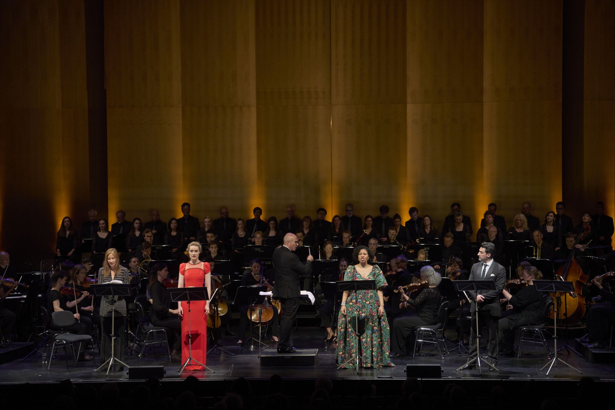 Positiva anche la prova fornita da una compagnia di canto in complesso decisamente notevole per equilibrio complessivo. Il Max del tenore statunitense Charles Castronovo era complessivamente apprezzabile per l’ incisività del fraseggio, anche se la voce nel registro acuto non è luminosissima perché al di sopra del FA il suono non “gira”, come si dice nel gergo degli appassionati e quindi le note alte suonano forzate. Il cinquantaquattrenne basso-baritono Kyle Ketelsen, nativo dello Iowa e cantante dalla carriera internazionale abbastanza interessante, ha reso bene gli aspetti satanici della figura di Kaspar tramite una voce autorevole e un fraseggio assai incisivo. Efficaci dal punto di vista vocale erano il Kilian di Milan Siljanov e l’ Ottokar di Levente Pál. Il basso coreano Jongmin Park ha dato adeguata imponenza alle figure di Kuno e dell’ Eremita con una voce ampia e di timbro davvero interessante. Notevolissima è stata soprattutto la prova delle due voci femminili, entrambe di qualità davvero notevole. Nikola Hillebrand, una tra le migliori cantanti tedesche della giovane generazione, dalla voce dolce e pastosa nei centri e dalla dizione scolpita e raffinata, ha impersonato una Ännchen aggraziata, spiritosa, vivace nel fraseggio e interpretativamente simpaticissima. Assai notevole è apparsa anche l’ Agathe del soprano Golda Schultz, quarantaduenne cantante sudafricana dai mezzi vocali davvero importanti per qualità e omogeneità di suono. La sua esecuzione della stupenda aria “Und ob die Wolke sie verhülle” era davvero molto apprezzabile per il buon legato, la luminositá del timbro e un accento giustamente malinconico e sognante. Molto brava era anche Johanna Wokalek, una tra le più rinomate attrici teatrali e cinematografiche tedesche, alla quale era affidata la lettura dei testi che in questa esecuzione sostituivano i dialoghi parlati originali. Nel complesso una lettura di ottima qualità e pienamente convincente sotto il profilo interpretativo, salutata da lunghi applausi da parte del pubblico del Festspielhaus.