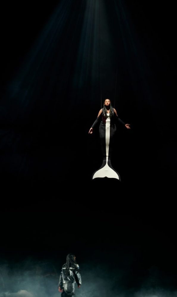Veniamo adesso a descrivere il contenuto del lavoro. Der rote Wal è un testo scritto da Markus Winter insieme a Martin G. Berger, che era anche il regista della produzione, e musicato dai fratelli Vivan e Khetan Batti, compositori tedeschi di origini indiane attivi soprattutto nel campo della musica da teatro e delle colonne sonore per film, tra le quali io personalmente ricordo quella assai ben riuscita di Woyzeck, adattamento filmico della celebre tragedia di Georg Büchner girato nel 2013 da Nuran David Calis con Tom Schillings nei panni del protagonista. Il libretto ha il suo focus nella rievocazione della vicenda del gruppo terroristico Rote Armee Fraktion (RAF) che è molto legata alla storia di Stuttgart in quanto essa fu la sede dei primi processi contro i terroristi si svolsero e tre di loro si tolsero la vita nel carcere di Stammheim, in circostanze mai completamente chiarite e la cui ricostruzione ufficiale è tuttora oggetto di pesanti dubbi. Da questi fatti Markus Winter, rapper nativo di Kornwestheim che sulla scena si esibisce con lo pseudonimo di Maeckes, ha tratto spunto per una specie di favola ispirata a quella della Sirenetta di Hans Chistian Andersen e al mito di Rusalka, in cui la protagonista è uno spirito ultraterreno che assume sembianze umane, integrata da elementi della storia di Moby Dick, il celebre romanzo di Hermann Melville che i membri del gruppo Baader-Meinhof leggevano in carcere riconoscendosi nei personaggi che davano la caccia alla balena bianca da loro vista come simbolo del potere. Il regista fa iniziare l’ azione con il video di una scolaresca che si raduna nel foyer del teatro prima dello spettacolo. In leggero ritardo arriva Isi, una giovane studentessa politicamente impegnata che all’ entrata nel teatro si inserisce nella storia assumendo le sembianze di Gladis, un’ orca marina che vuole vendicarsi delle ferite inflittele dalle navi e per questo vuole andare sulla terra assumendo sembianze umane con l’ aiuto dello spirito Lone, che glielo concede in cambio di una sua pinna.