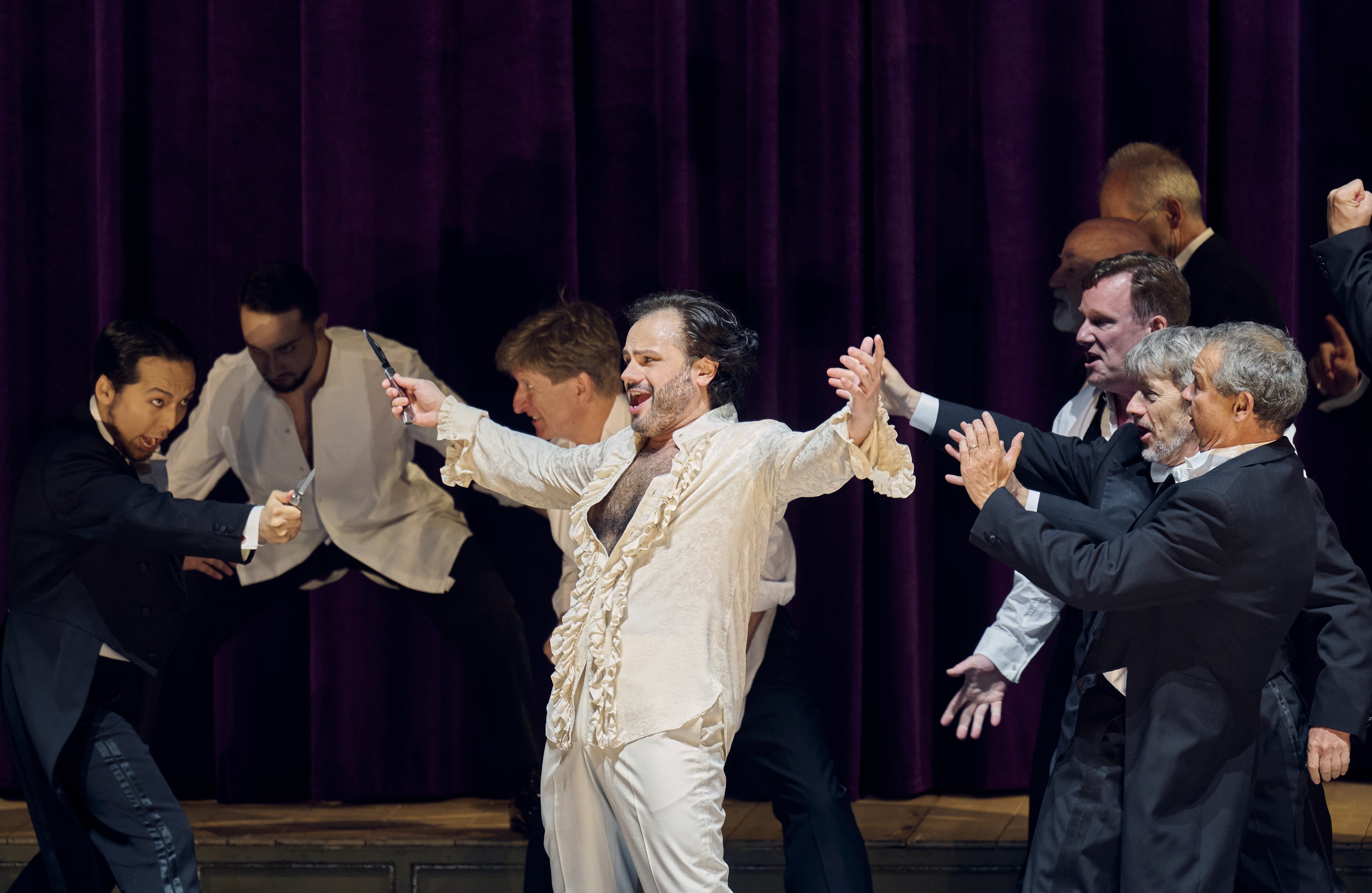 Glücklicherweise tat all dies der Leistung der Sängerbesetzung keinen Abbruch, die zweifellos ein sehr gutes Niveau erreichte. Das Dirigat von Andriy Yurkevich, einem ukrainischen Musiker, der seit mehreren Jahren in Italien lebt, zeugte von bemerkenswerter dramatischer Intensität und großer Aufmerksamkeit für die Bedürfnisse der Sänger, die mit Flexibilität und Anpassungsfähigkeit einhergingen. Glücklicherweise tat all dies der Leistung der Sängerbesetzung keinen Abbruch, die zweifellos ein sehr hohes Niveau erreichte. Das Stuttgarter Staatsorchester setzte die Interpretationsideen des Dirigenten mit erlesenem Klang und tadelloser technischer Klarheit um. Was die Titelrolle betrifft, so war die Interpretation von Martin Gantner, einem sechzigjährigen Bariton aus Freiburg, der vor allem als Spezialist für das Wagner-Repertoire bekannt ist, zweifellos voller guter Absichten, konnte aber leider aufgrund seiner trockenen Stimme, die in den vielen Passagen mit hohem Register forciert und hölzern klang, nicht immer umgesetzt werden. Trotz der guten italienischen Aussprache des Sängers kam die komplexe Persönlichkeit des in seiner Vaterliebe verletzten Narren nur sporadisch zum Vorschein.