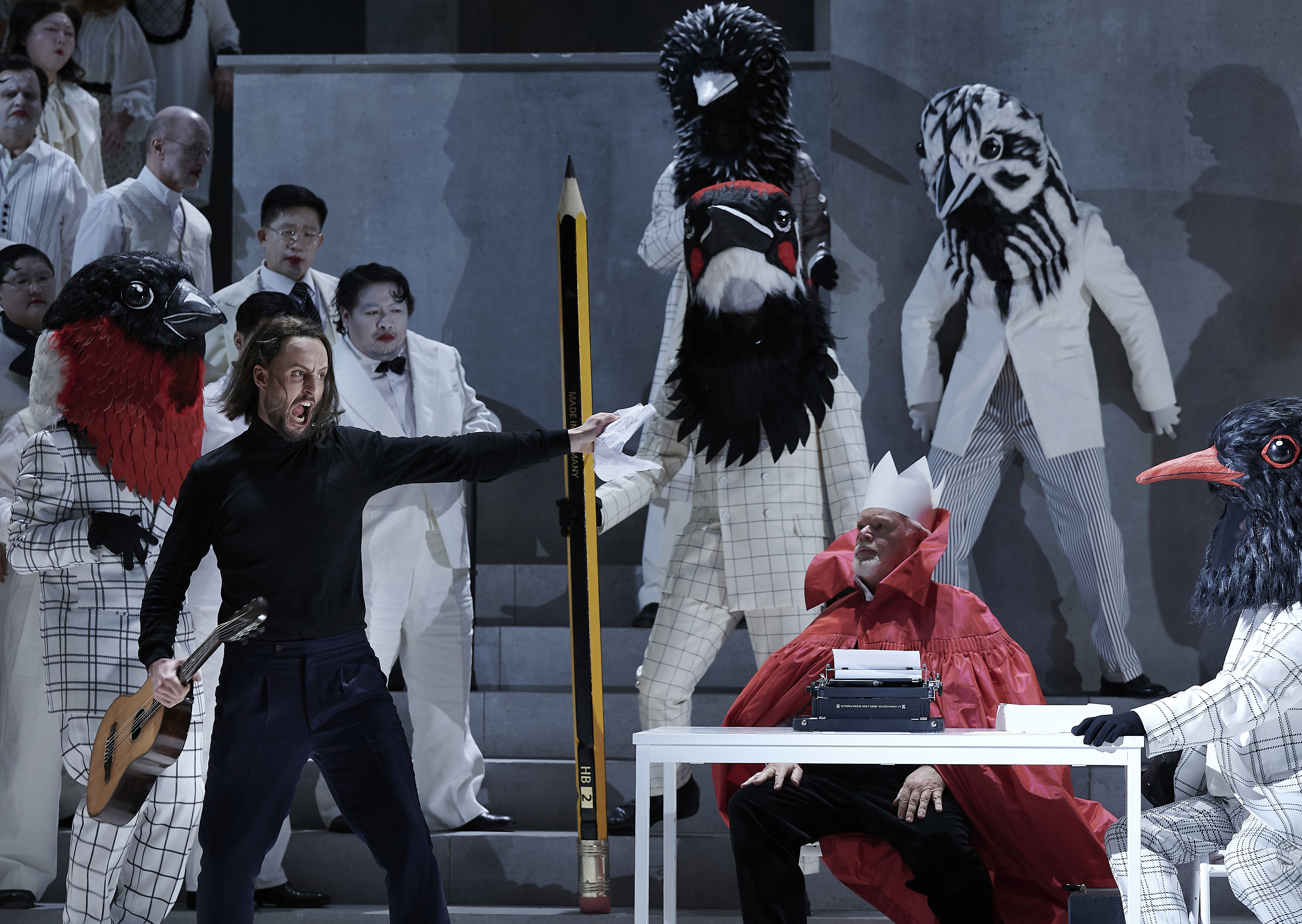 Auch die Vokalbesetzung war hochkarätig und bestand ausschließlich aus Debütanten in ihren jeweiligen Rollen. Martin Gantner, ein 62-jähriger Bassbariton aus Freiburg, überzeugte als Hans Sachs durch seine geschliffene Aussprache und Detailgenauigkeit. David Steffens überzeugte als Pogner mit einer warmen, vollen Stimme und väterlich-liebevoller Phrasierung. Daniel Behle, ein meisterhafter Interpret des David, gab sein Debüt als Walther und stellte dabei sein prägnantes und individuelles Phrasierungsvermögen unter Beweis. Kai Kluges David war exzellent, mit seiner lebhaften Bühnenpräsenz und seinem überaus passenden und großartigen Gesang. Der wohl beste der männlichen Sänger war sicherlich Björn Bürger, der einen charismatischen Beckmesser verkörperte und im zweiten Akt mit seiner Serenade alle zum Tanzen brachte. Esther Dierkes sang die Rolle der Eva sehr gut, auch wenn sie die Figur noch reifen lassen sollte, und Maria Theresa Ullrich gab eine feministische und mitunter sogar sexy Magdalena – vielleicht nicht ganz passend, aber sehr wirkungsvoll. Am Ende war es ein triumphaler Erfolg für alle Mitglieder des musikalischen Ensembles, doch Regisseurin Stöppler und ihr Team wurden von einem Teil des Publikums mit deutlichen Buhrufen empfangen für ihren Bärendienst an Wagner. Und dem stimme ich vollkommen zu.