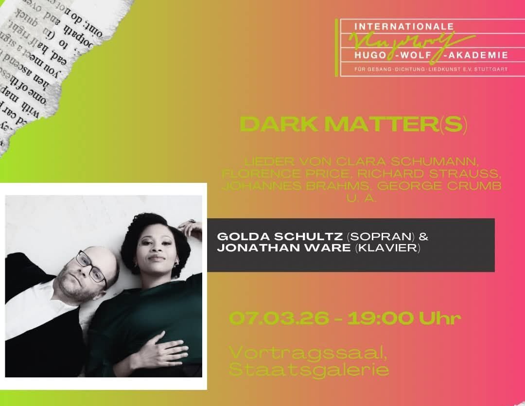 Avevo ascoltato per la prima volta in teatro Golda Schultz, quarantatreenne soprano sudafricano uscita dall’ Opernstudio della Bayerische Staatsoper e considerata fra le voci femminili più interessanti del momento, in una notevolissima interpretazione del ruolo di Agathe in Der Freischütz lo scorso anno a Baden Baden nella quale mi aveva impressionato molto positivamente per i suoi mezzi vocali davvero notevoli dal üunto di vista dell’ omogeneità e qualità del suono oltre che per il buon legato, la luminosità del timbro e la personalità del fraseggio. Non ho quindi voluto perdermi la sua Liederabend inserita nel ciclo dei Galeriekonzerte organizzato dalla Hugo-Wolf-Akademie, una serie di appuntamenti che si tengono nella Vortragssaal della Staatsgalerie, il principale museo della città di Stuttgart, nella quale insieme a Jonathan Ware, quarantaduenne pianista texano col quale si esibisce abitualmente nei suoi recital, la cantante di Lapstadt presentava un programma intitolato Dark Matter(s), che sta portanto attualmente in tournée e che comprende musiche illustranti gli aspetti più oscuri dell’ esistenza umana, con testi accomunati dalla descrizione di apparizioni notturne, allucinazioni e incontri al chiaro di luna in un crescendo emozionale che raggiunge il suo vertice con le meditazioni sulla vita e sulla morte contenute nelle poesie dei Vier Letzte Lieder di Richard Strauss, posti a conclusione del concerto. Il percorso iniziava con Apparition di George Crumb, compositore nato nel 1929 in West Vurginia e scomparso quattro anni fa e allievo tra gli altri di Boris Blacher, insignito di prestigiosi riconoscimenti come il Pulitzer Prize for Music nel 1968 e il Grammy Award nel 2001, che in questa composizione ha utilizzato un teato tratto dall’ elegia When lilacs last in the dooryard bloom’d di Walt Whitman. Il ciclo di otto brani per voce e pianoforte amplificato, composto nel 1979, è assai ricco di fascino per la raffinatezza di una scrittura tramite la quale l’ autore crea un’ atmosfera evocante una sorta di arcaico pulviscolo sonoro estremamente smaterializzato, quasi atemporale in cui si inseriscono i melismi e i vocalizzi della linea di canto. Seguivano tre Lieder di Clara Schumann su testi di Heinrich Heine, i cui lavori furono una tra le principali fonti di ispirazione per entrambi i coniugi Schumann, dei quali Golda Schulz ha centrato perfettamente il tono incantato e trasognato, con bellissime sfumature vocali a cui il pianismo di Jonathan Ware creava una perfetta cornice sonora. Ricche di fascino erano anche le tre songs di Florence B. Price, musicista nativa dell’ Arkansas che fu la prima compositrice afroamericana la cui opera venne accettata nelle stagioni delle grandi istituzioni concertistche del suo paese e la cui produzione oggi è oggetto di una progressiva riscoperta, per l’ originalità di una scrittura che incorpora elementi spiritual enfatizzandone le ritmiche sincopate.