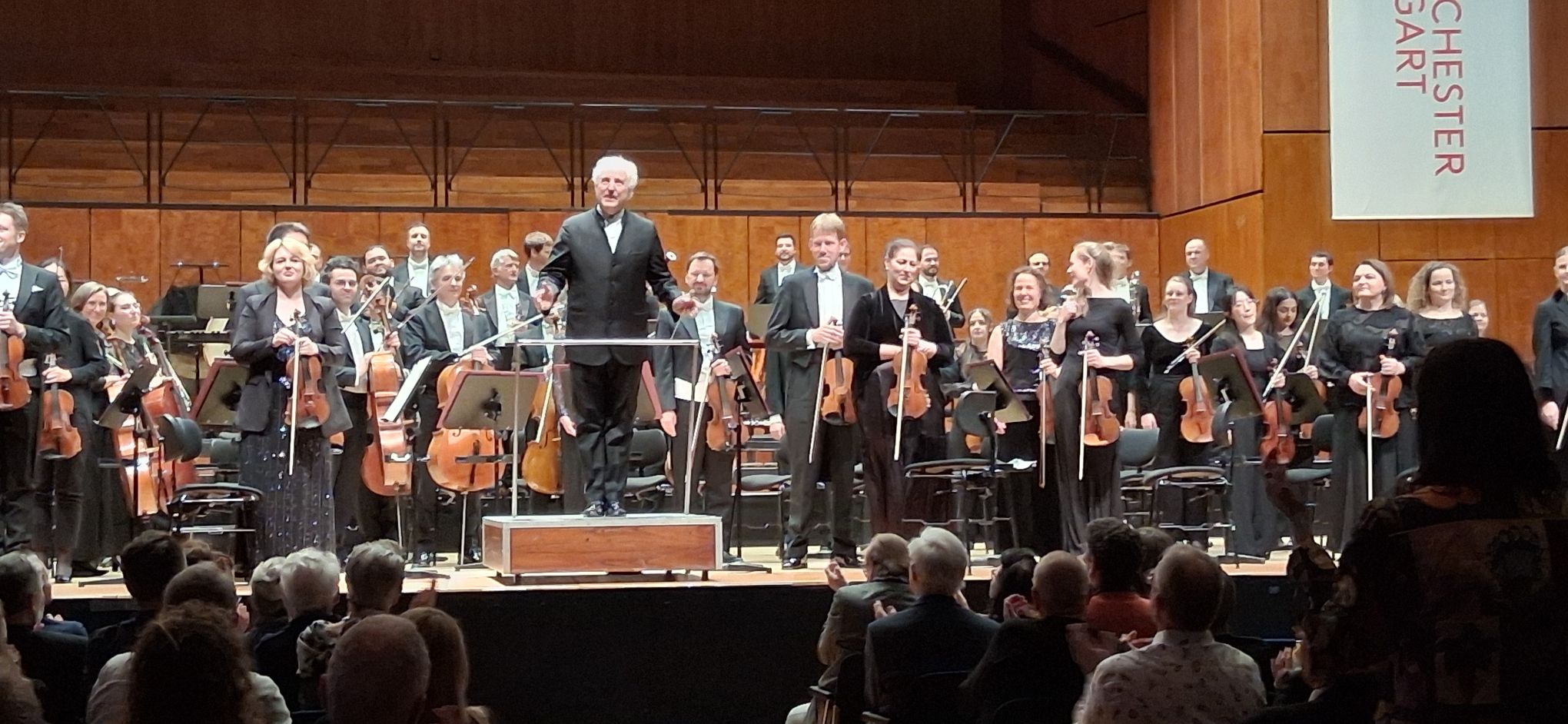 Dopo la pausa, Manfred Honeck e la Staatsorchester Stuttgart hanno presentato la celebre Sinfonia N°9 in mi minore op. 95 “Dal Nuovo Mondo” di Antonin Dvořák. Il direttore austriaco ne ha dato un’ interpretazione complessivamente molto pregevole, energica e ricca di contrasti, decisamente notevole per espressività, slancio e precisione. I tempi adottati da Honeck erano complessivamente molto contrastanti e ricchi di flessibilità, con un’ eleganza notevole nel sottolineare le sfumature e il respiro delle melodie di carattere popolareggiante che formano la struttura principale della composizione. Molto apprezzabile è apparso il contrasto assai marcato tra un’ introduzione tenuta su un ritmo abbastanza largo e un Allegro molto ricco di energia e ben definito nelle strutture. Assai ben riuscito anche il Largo, in cui la morbidezza di suono esibita dalla sezione fiati del complesso ha dato un bel fascino alle linee melodiche, soprattutto nella parte introduttiva. Anche i ritmi di danza nello Scherzo suonavano marcati in maniera efficace e complessivamente ottima mi è sembrata anche la definizione del movimento finale, con il progressivo accumularsi della tensione molto ben reso nelle progressioni ritmiche e senza mai saturare il suono. La Staatsorchester ha suonato con grande precisione e compattezza di suono realizzando in maniera eccellente tutte le indicazioni del podio. Il pubblico alla fine ha applaudito in maniera entusiastica un artista che negli anni passati ha dato un contributo di grande spessore alla vita musicale di Stuttgart e l’ attuale Generalmusikdirektor Cornelius Meister, con un gesto di squisita educazione, ha voluto rendere omaggio al suo predecessore consegnandogli personalmente il rituale mazzo di fiori.